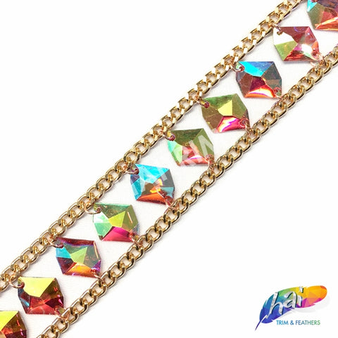 This is a fancy trimming made of iridescent 21x26mm cosmic resin stones connected by gold jump rings, connected to chain links. Perfect for any dance, Broadway, or carnival costume project. Can be cut into shorter strips or individual pieces for headpiece, arm or leg pieces, and other parts!
