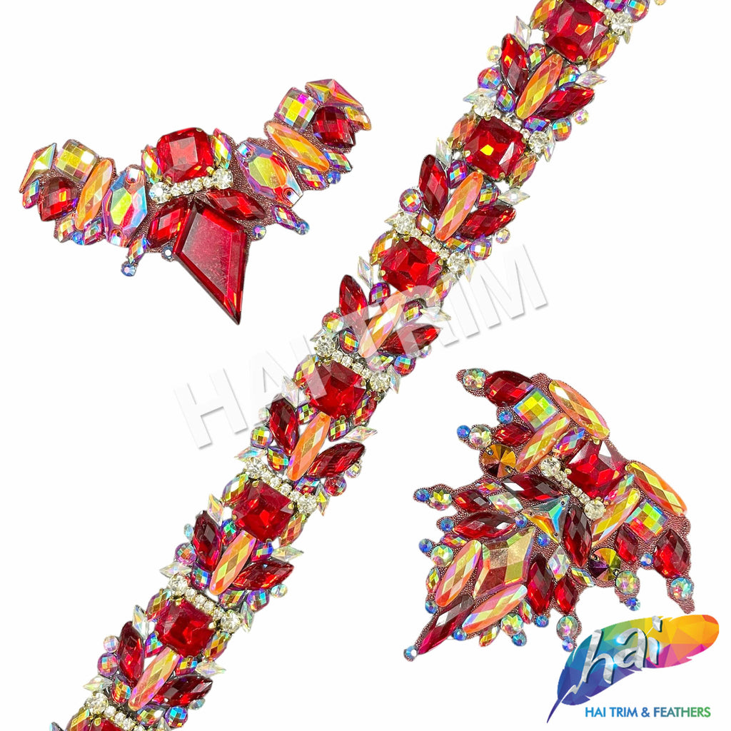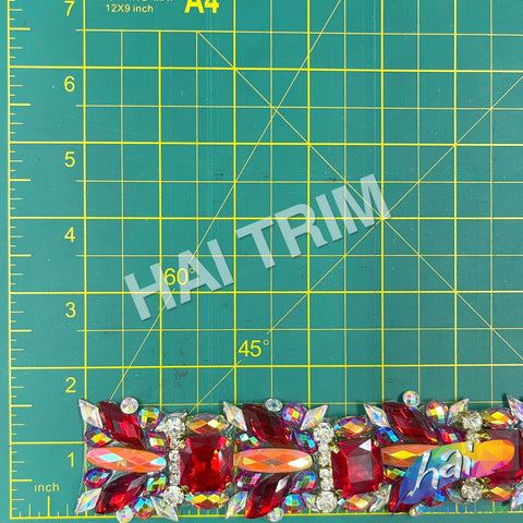 Stunning jeweled iron on trim made with red glass jewel octagon pieces encased in gold rhinestone setting (cut pieces from YH-091 trim) and various resin stones in dark red (DD16), matte orange AB (SSAB09), red AB (DDAB04), and clear AB (DDAB01) colors.
