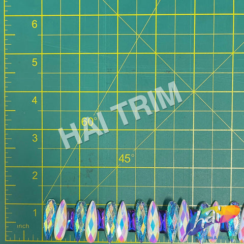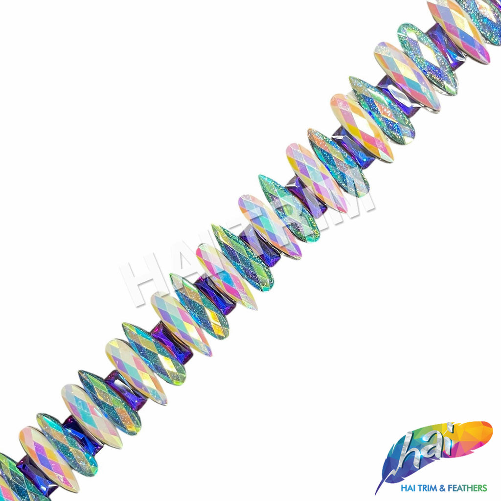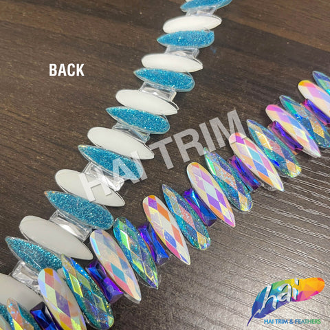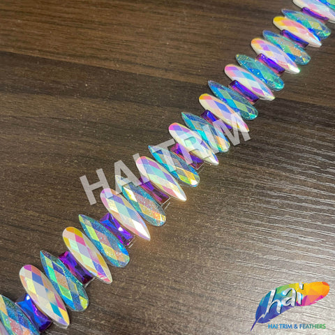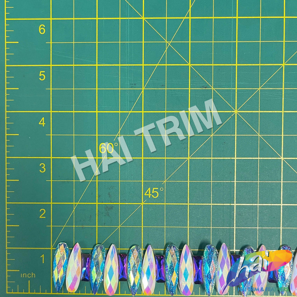 Extraordinary iron on trim made with 8x28mm teardrop resin stones in matte white AB (SSAB01), aqua AB glitterback (YSAB12) colors arranged side by side then separated by a small purple blue rectangle stones.