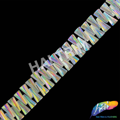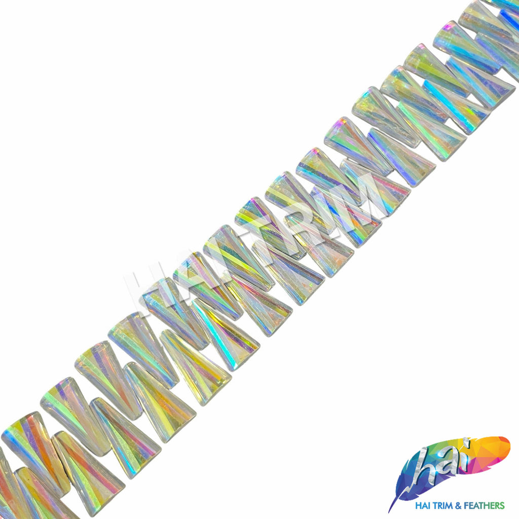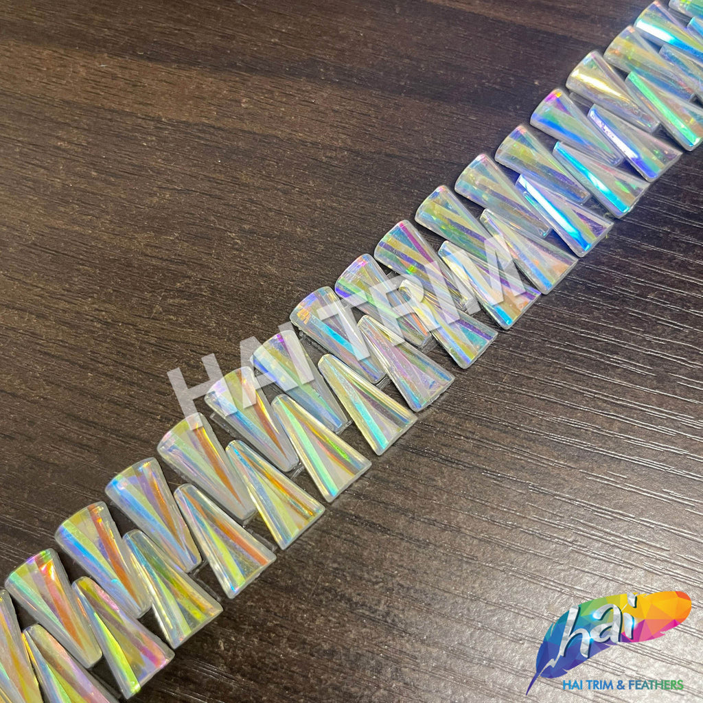 Timeless iron on trim made with 9x18mm clear AB (DDAB01) half cone resin stones arranged in a symmetrical design pattern.