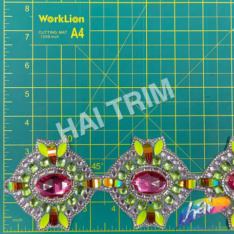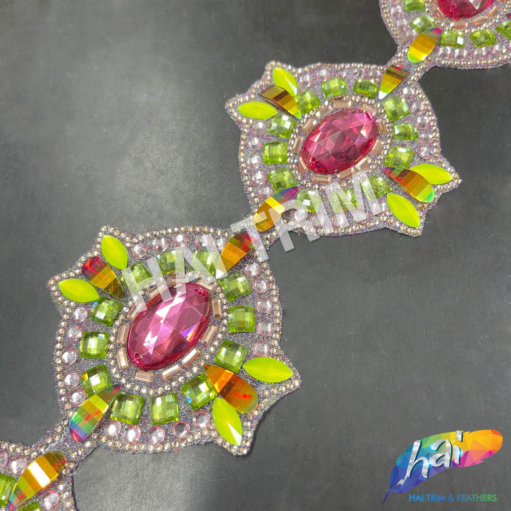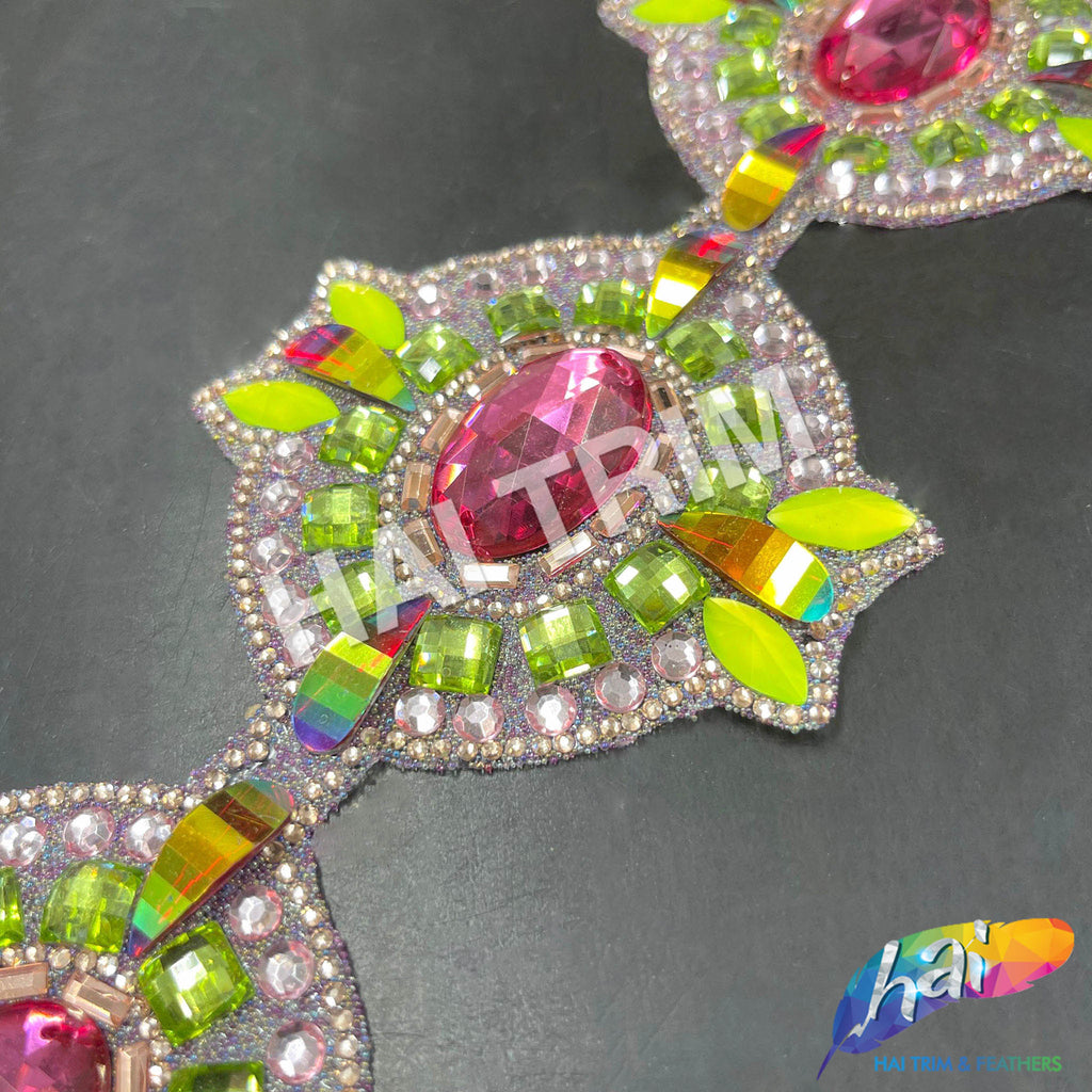 This trim is made of a mixture of resin and acrylic stones in pink, neon yellow, lime green, and red AB colors in different shapes forming a chained medallion strip. The materials are attached to a transparent gel-back film which can be ironed! It can be cut into smaller pieces using regular scissors.