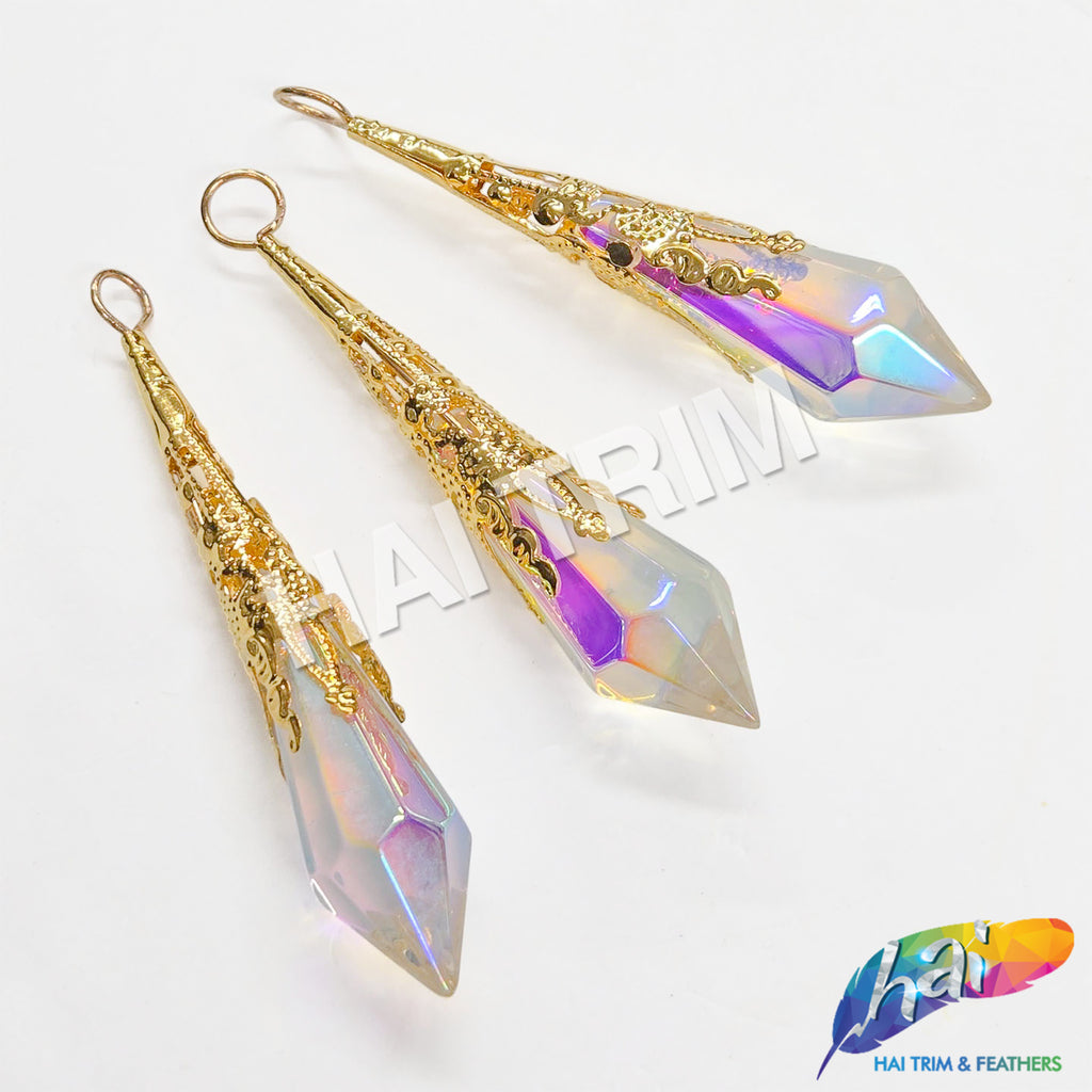 The crystal is securely attached to a lightweight gold plated cap with a detailed design. A sturdy loop at the base allows for easy attachment to any project.