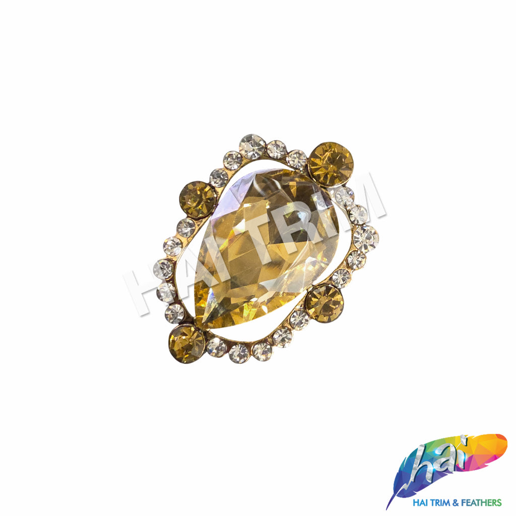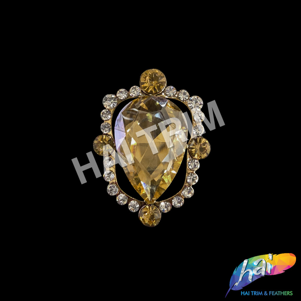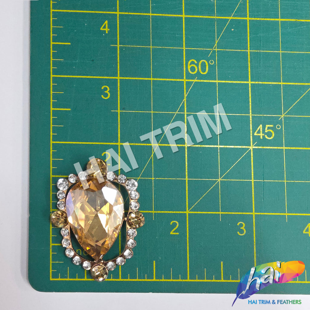 Elegant glass rhinestone jewel piece in gold or light Colorado topaz color. This piece features a large, faceted teardrop stone at the center, surrounded by small crystal rhinestones, all set in a gold metal setting. This piece does not have any holes and the back is semi-rounded.
