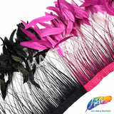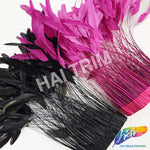 This bleached dyed stripped rooster tail/coque feather fringe is dyed in multiple colors. Each feather strip is strung on a ribbon sold per 1/2 yard or 18 inches.