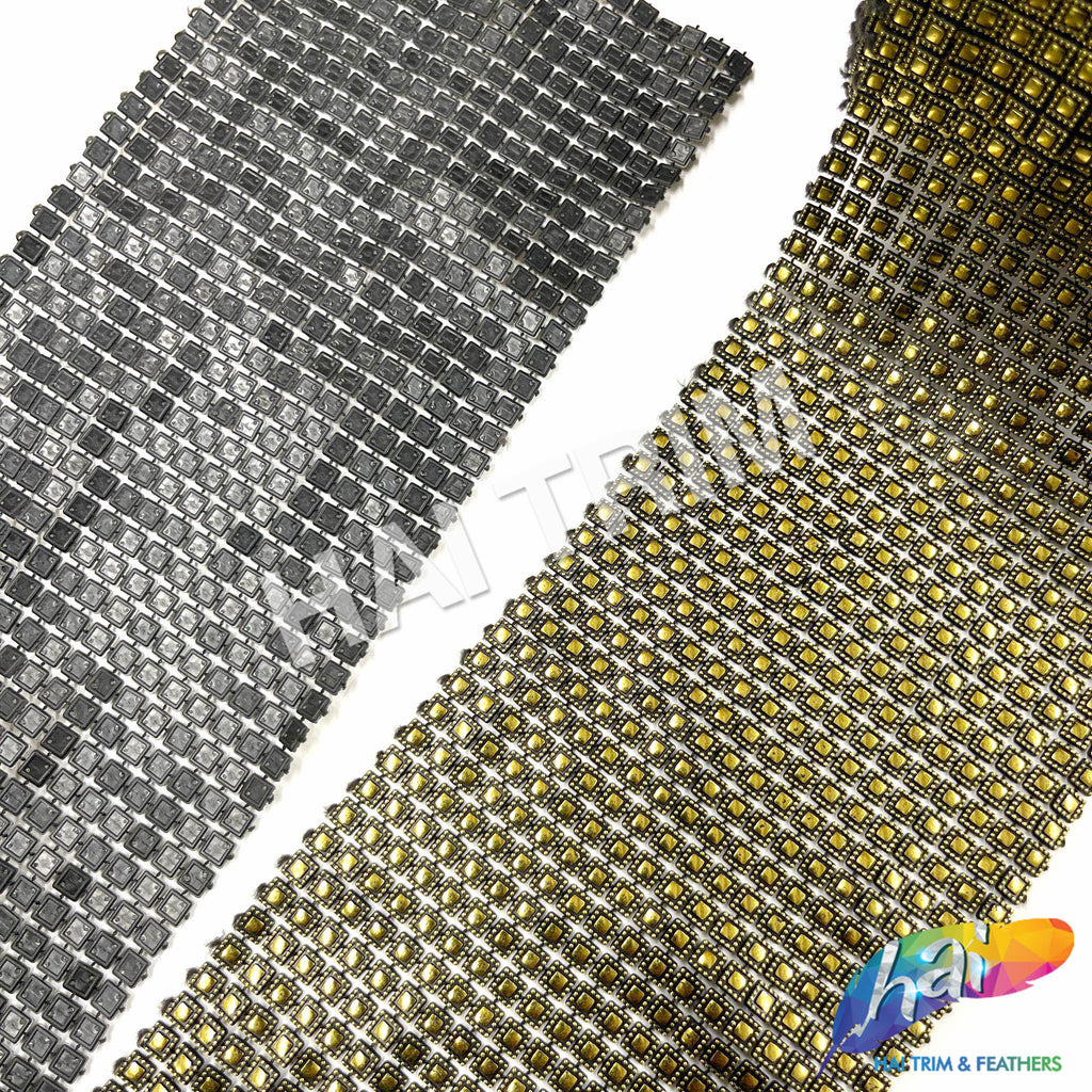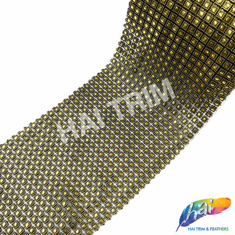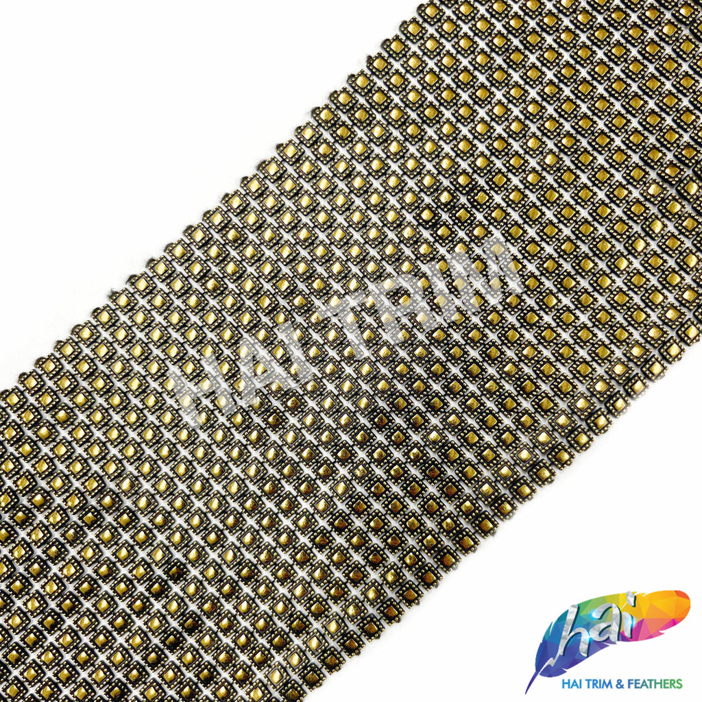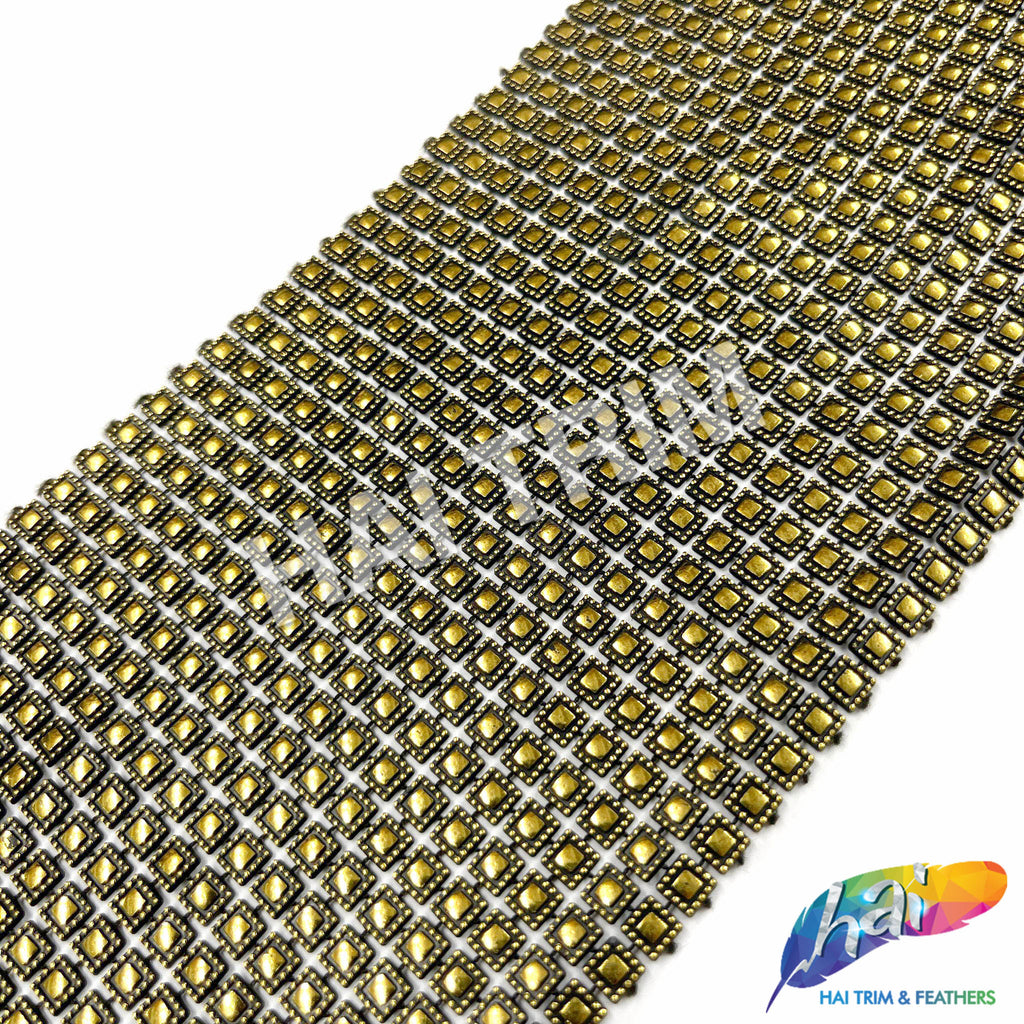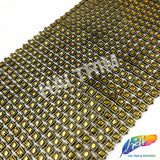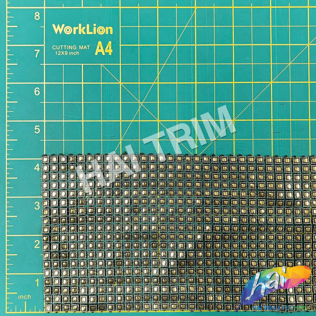 18-row gold square plastic stud banding with black backing. Each square stud measures 5x5 mm and has a small dotted border. The studs are connected by black thread and can be cut into smaller pieces or strips using regular scissors.