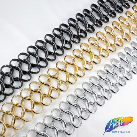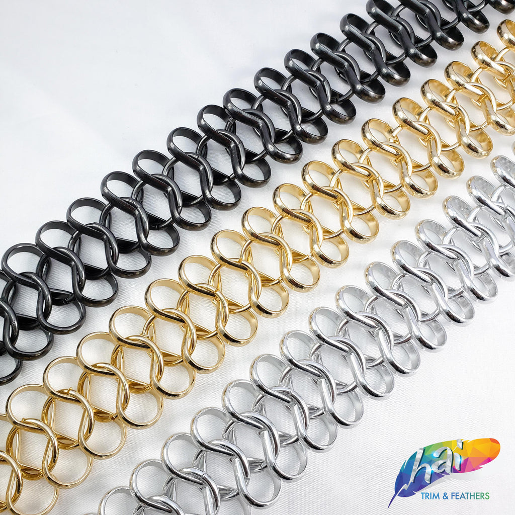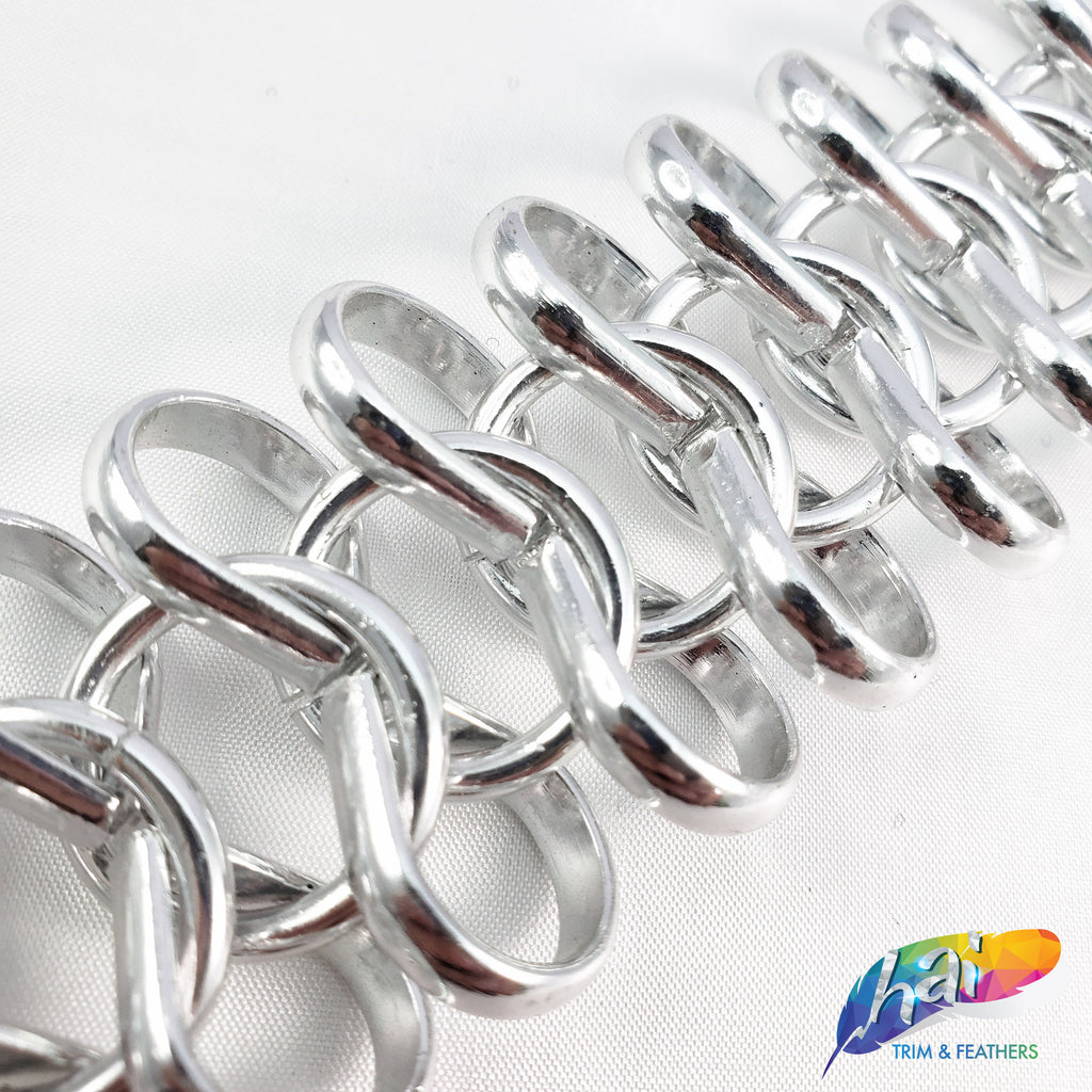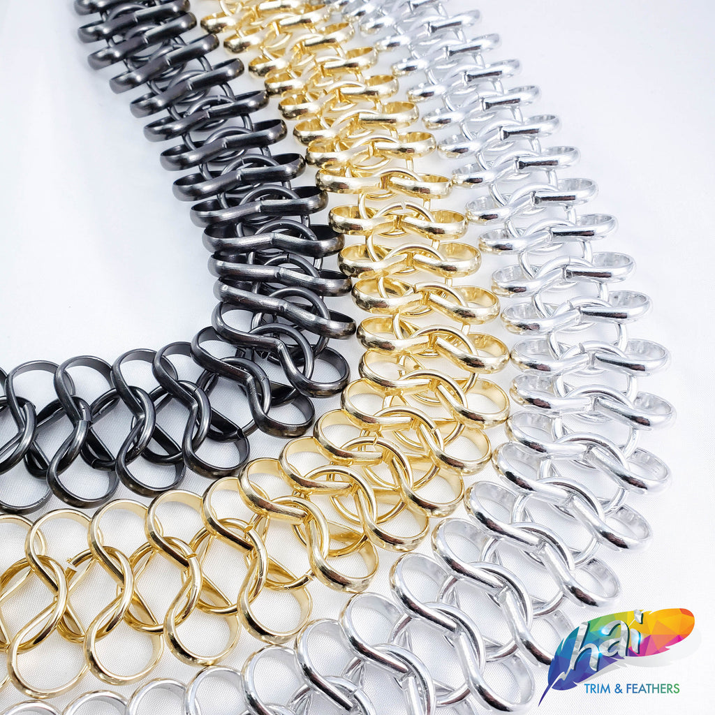 Lightweight metallic chain made of infinity shape chain links connected by a jump ring in the middle. These chains are made of aluminum, perfect to use as embellishment on your costume.