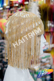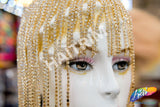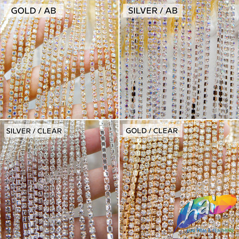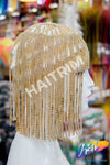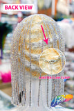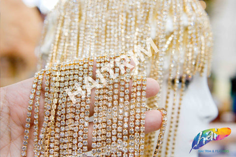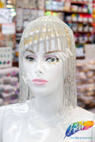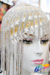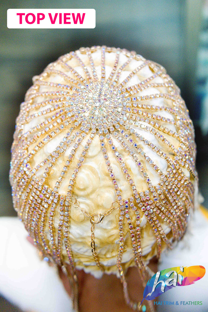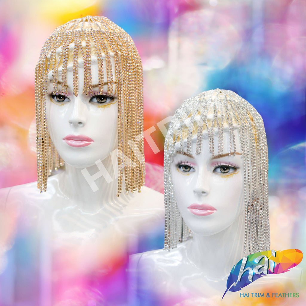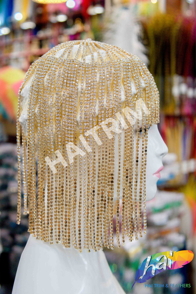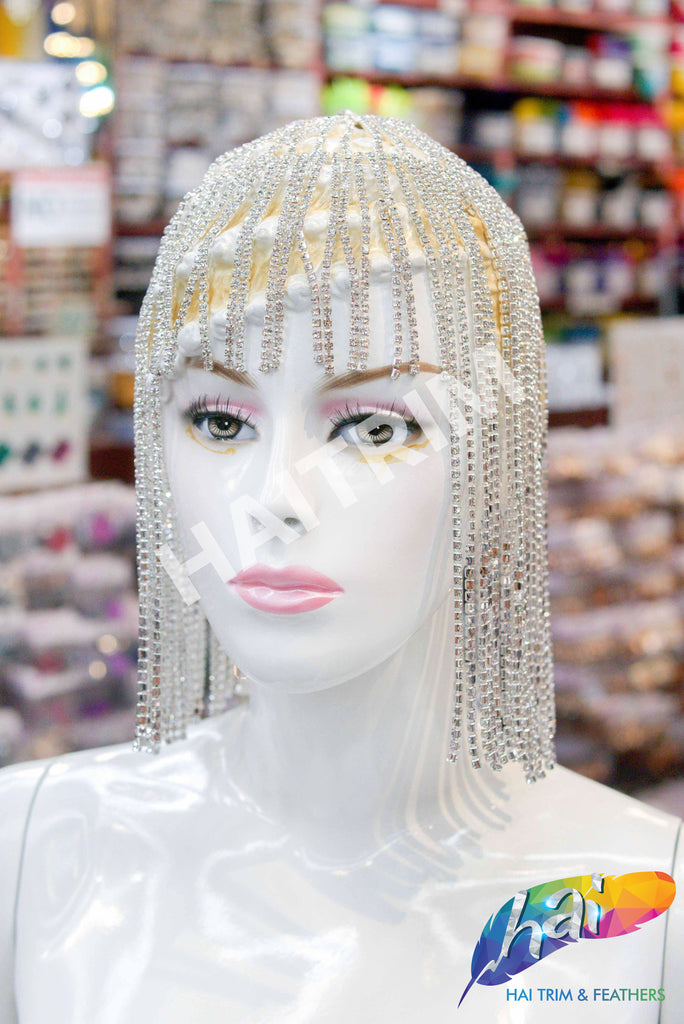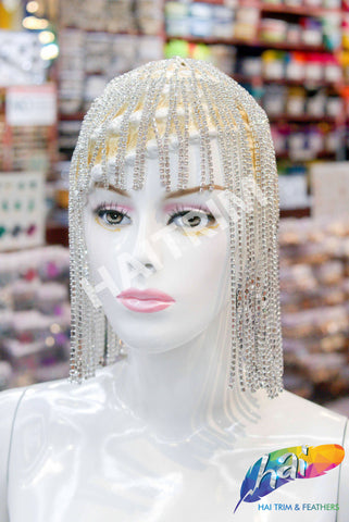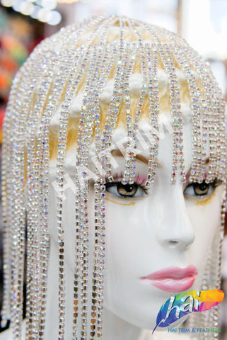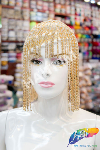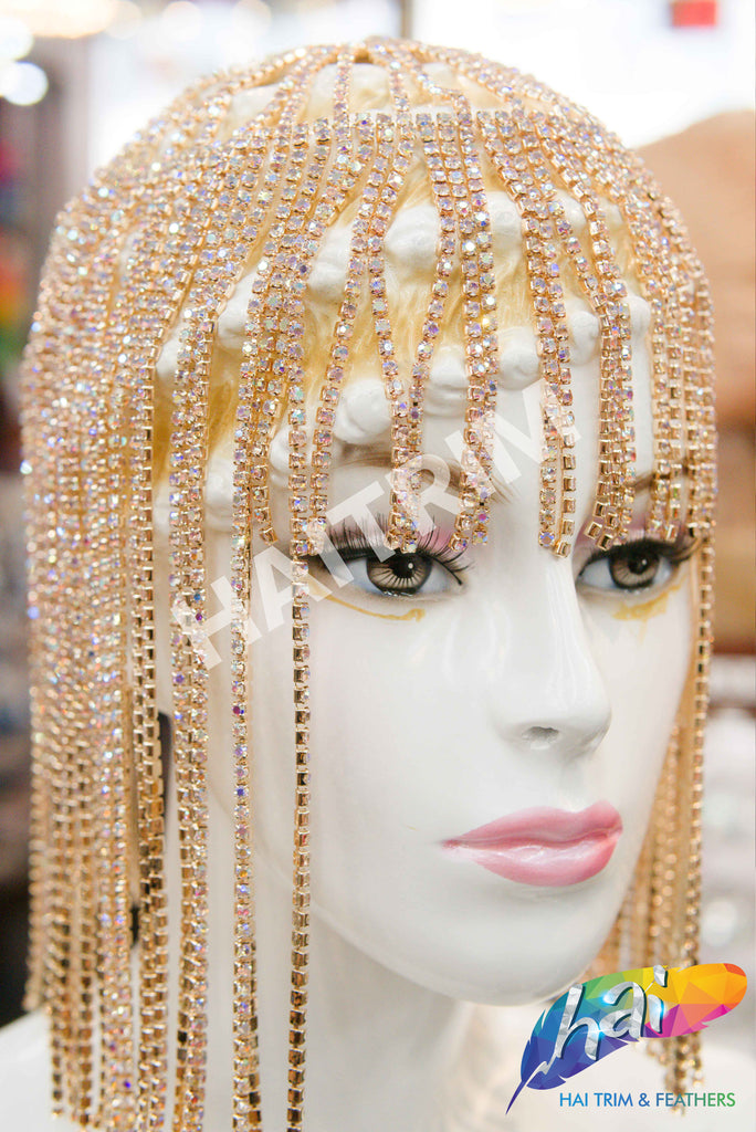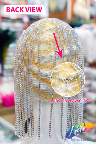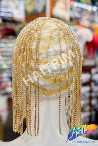 Luxurious headpiece made with dangling crystal rhinestone cupchain trims connected to each other creating this magnificent jewelry accessory. Each strand has SS16 (4 millimeter) sizes rhinestones encased in metallic colored setting.