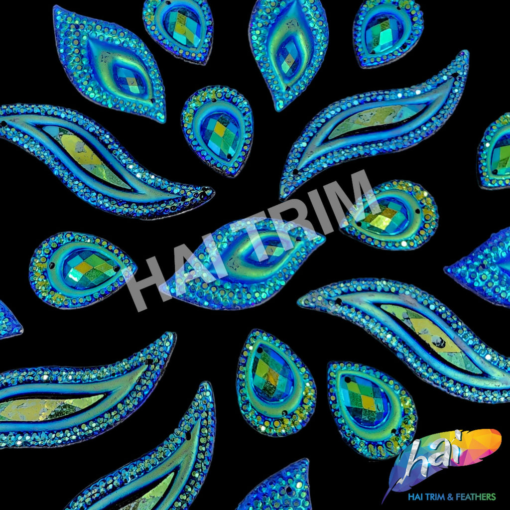 Extraordinary color iridescent resin stones with a multifaceted textured finish in different shapes and sizes. The top of each stone has multiple cuts and textures featuring very tiny studs on the edges, smooth flow finishes through the middle part of the stone encasing a smaller stone at the center. The back of each stone is flat with black backing.
