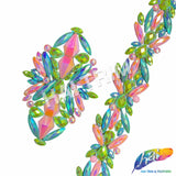 This is an iron-on/gel-back applique made of various resin/acrylic stones in different shapes and sizes in matte lime green AB (SSAB08), matte pink AB (SSAB04), and matte turquoise AB (SSAB05) colors. Can be cut into smaller pieces using regular scissors. Perfect applique for bra tops, leg and shoulder pieces, and more!