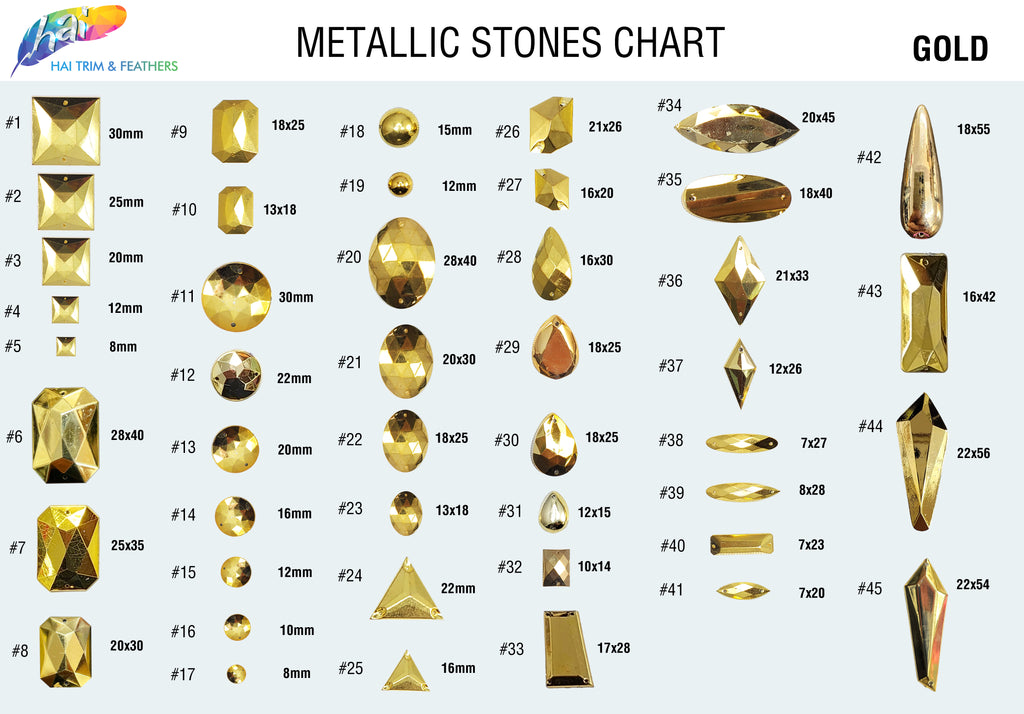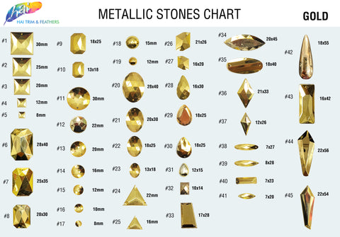Metallic gold stones in various shapes and sizes. These are acrylic/resin quality stones.