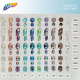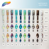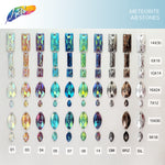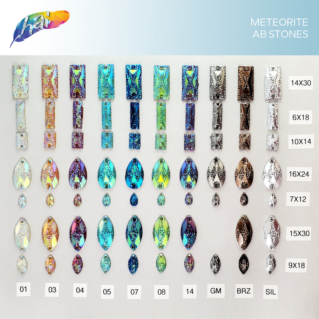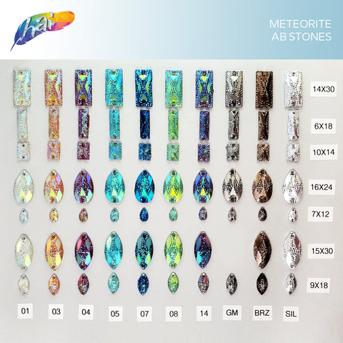 Color AB resin stones with very small round stones on top, resembling a meteorite. These stones have a textured finish and available in 16 different styles. Each stone has two holes on the side for sewing. It can be glued as well using E6000 or any type of glue.