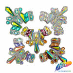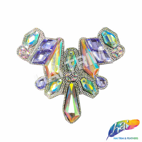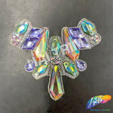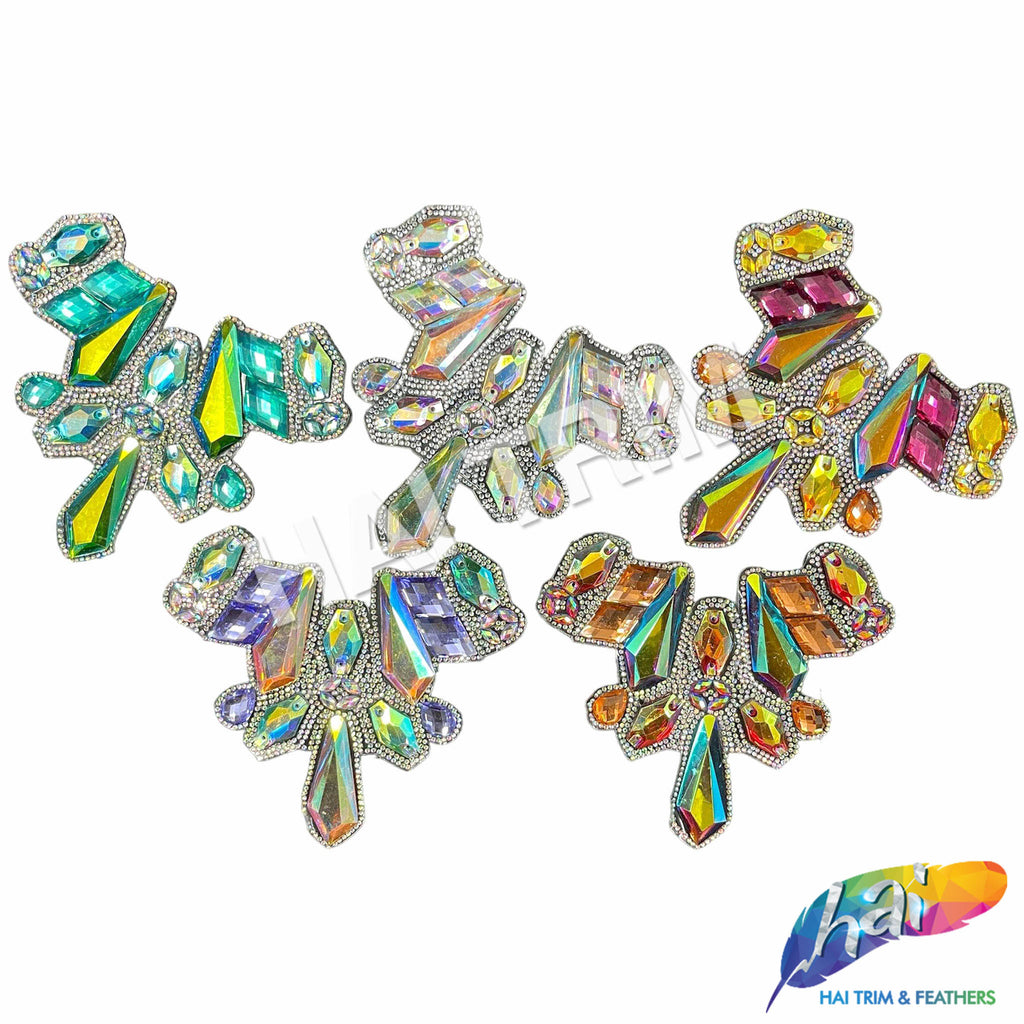 This is an iron-on/gel-back applique made of fancy resin stones in color and color AB colors in different shapes and sizes, bordered with little crystal AB rhinestones. It can be cut into smaller pieces.