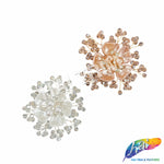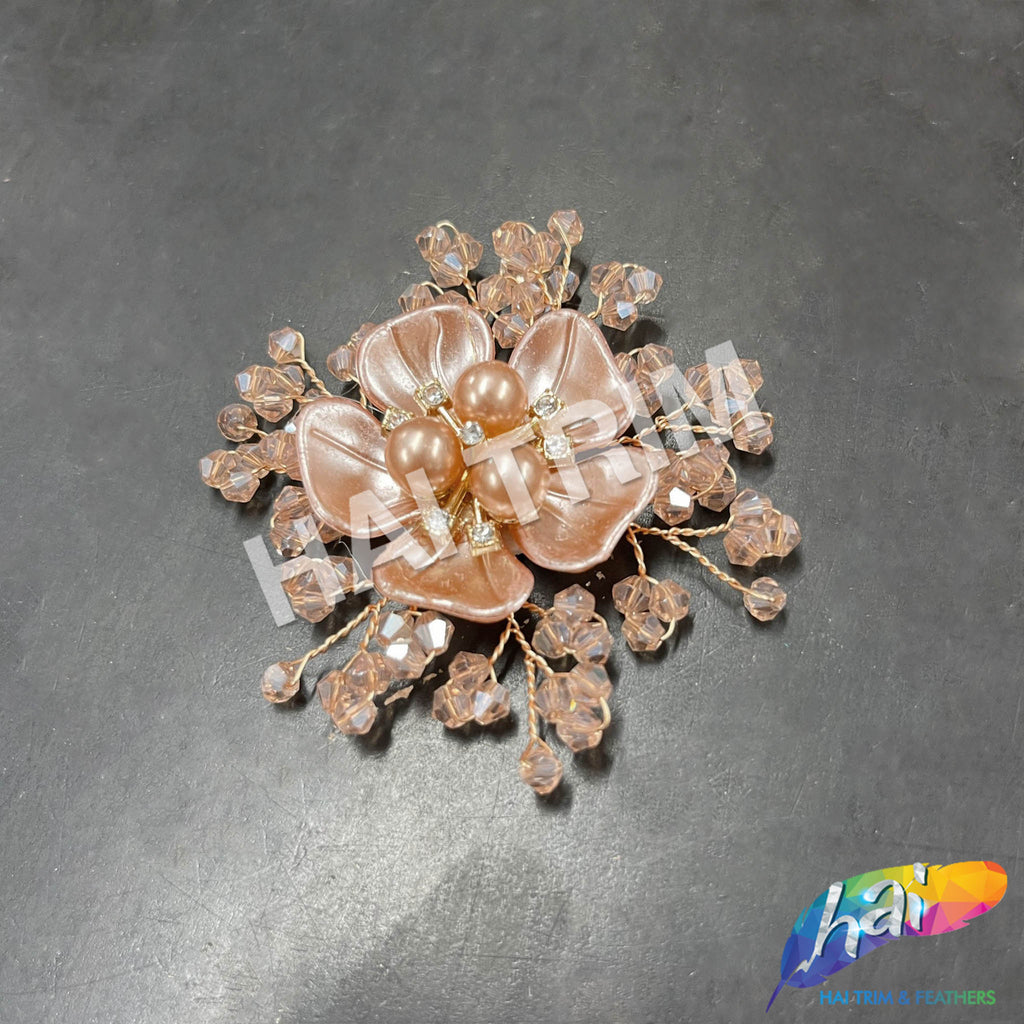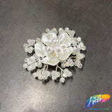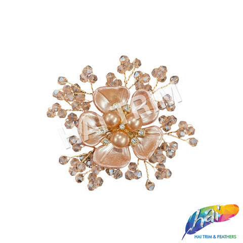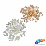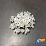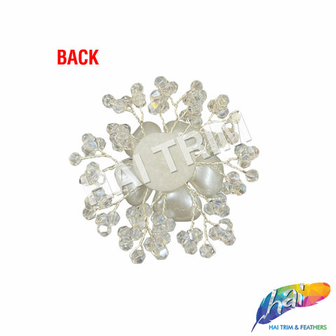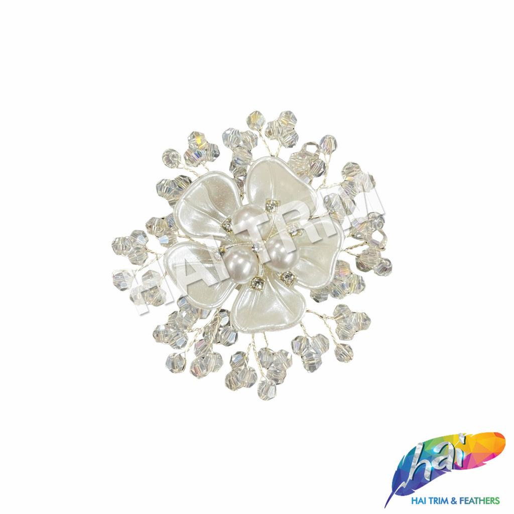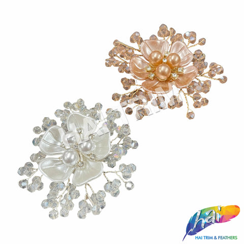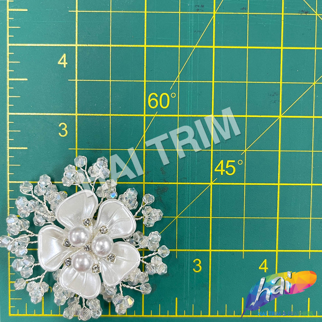 Exquisite beaded rhinestone applique made of 8mm pearl beads, pearlized petals, and rhinestones on a stamen-looking metal setting attached to a bed of wired rondell bead branches. The back of the applique has a white felt for easy attachment.