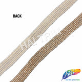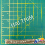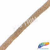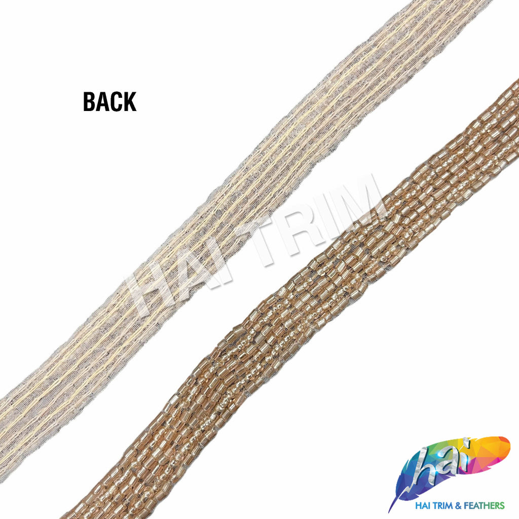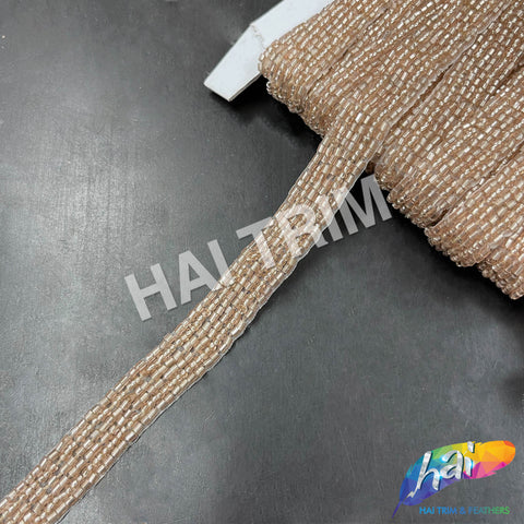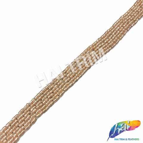 Classic beaded trim made of seed and half bugle beads in rose gold color. This trim has 6 rows of beads sewn on a mesh material. Can be cut into smaller strips using regular scissors; however, the back must be reinforced (glued) before cutting as the beads may fall off.